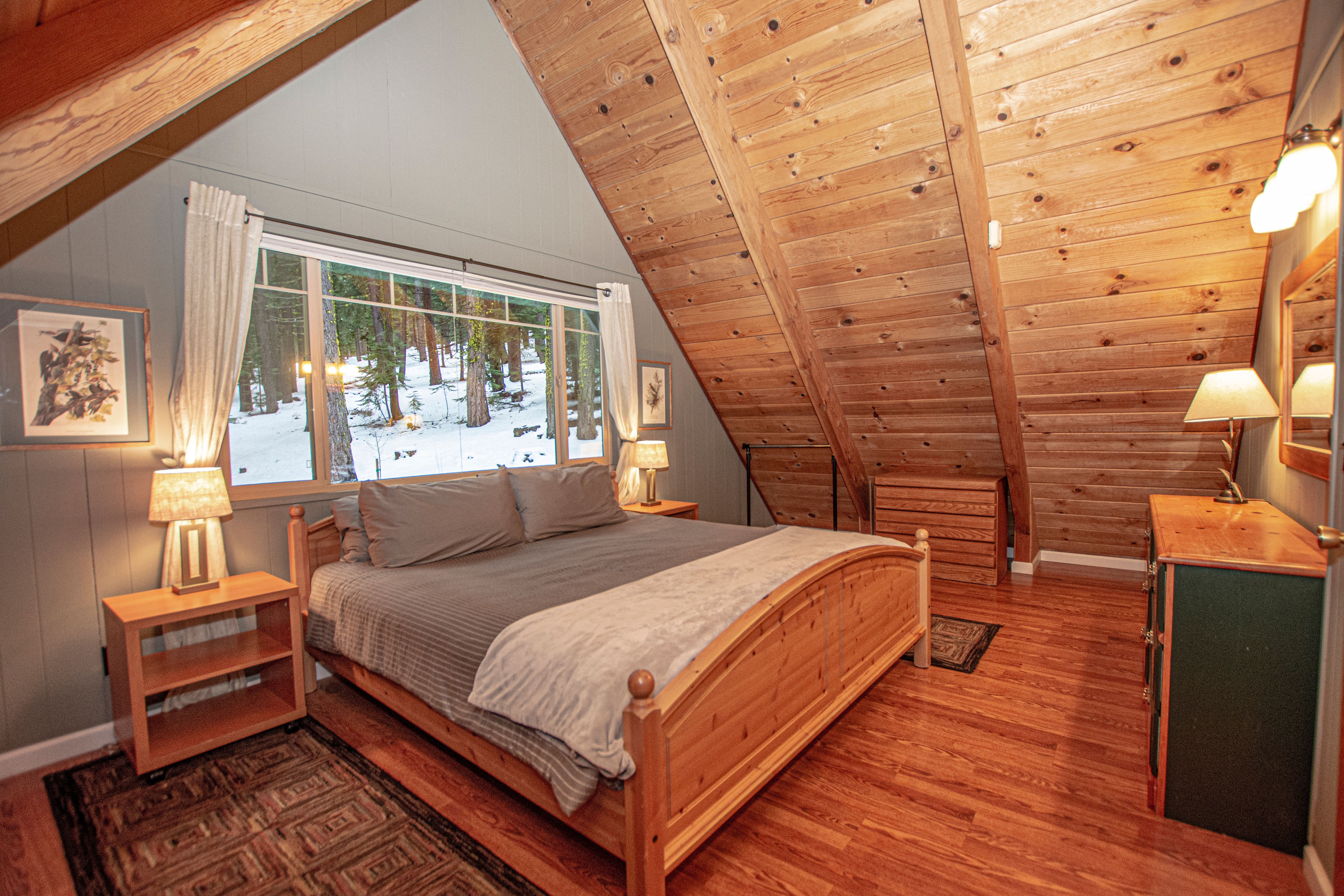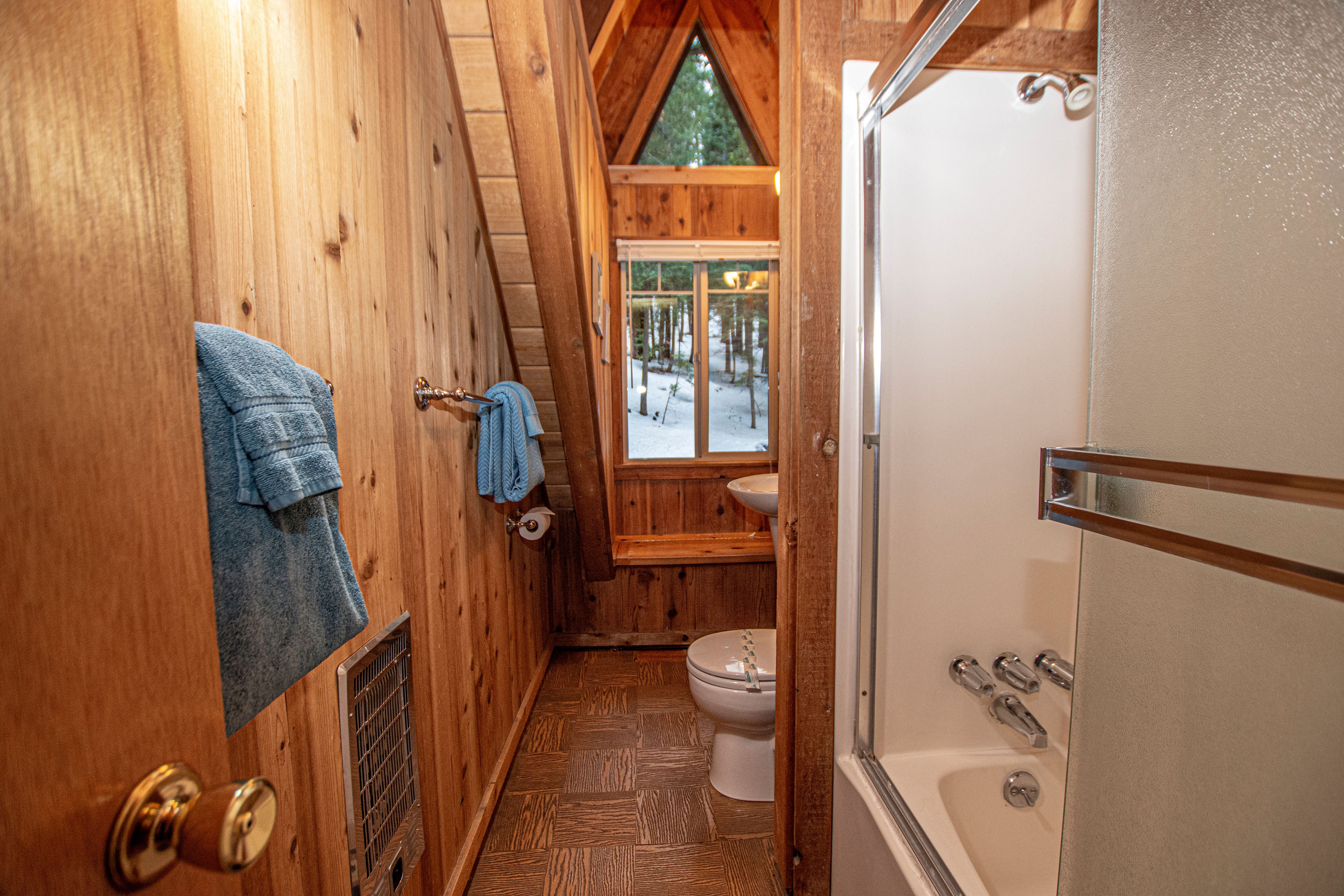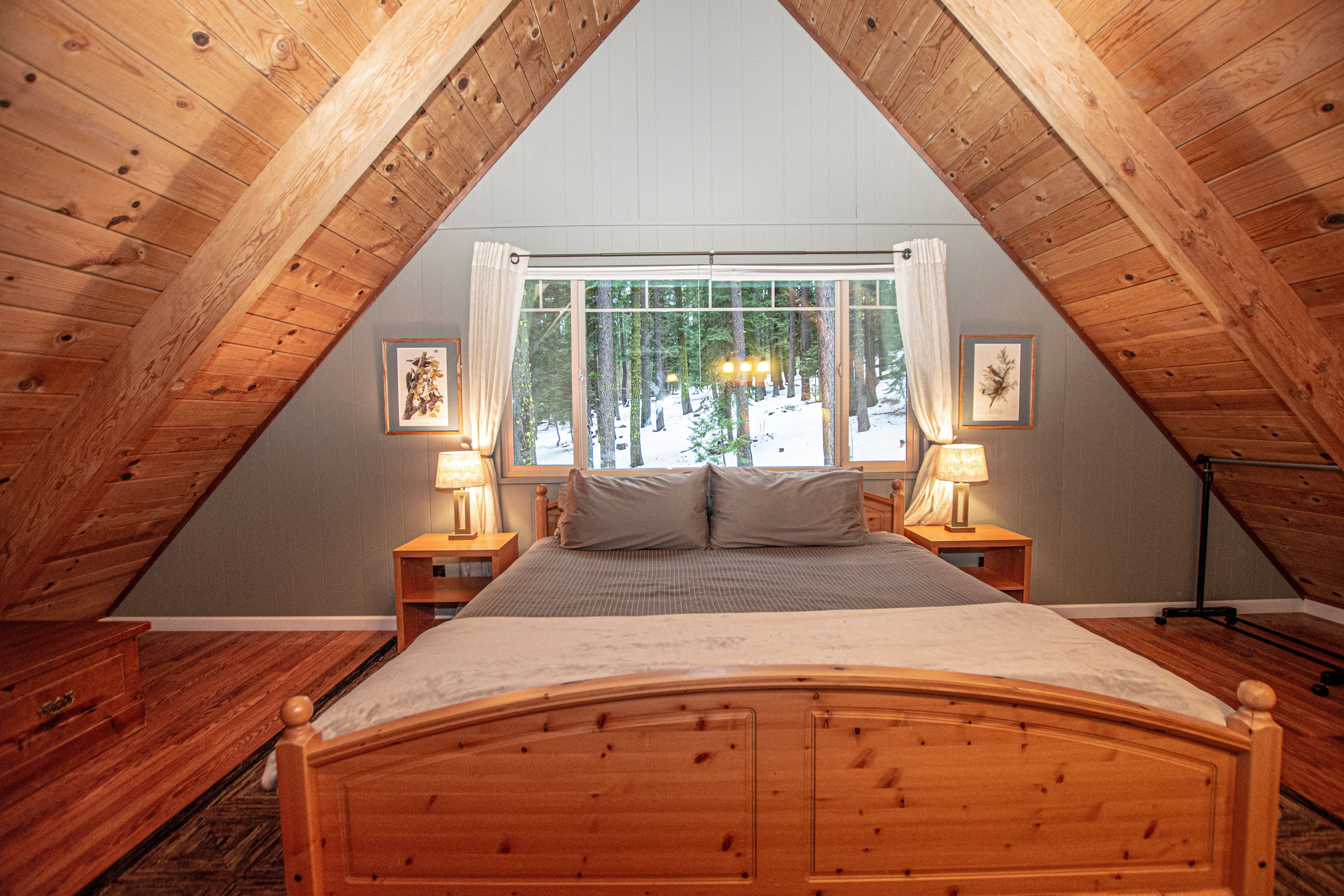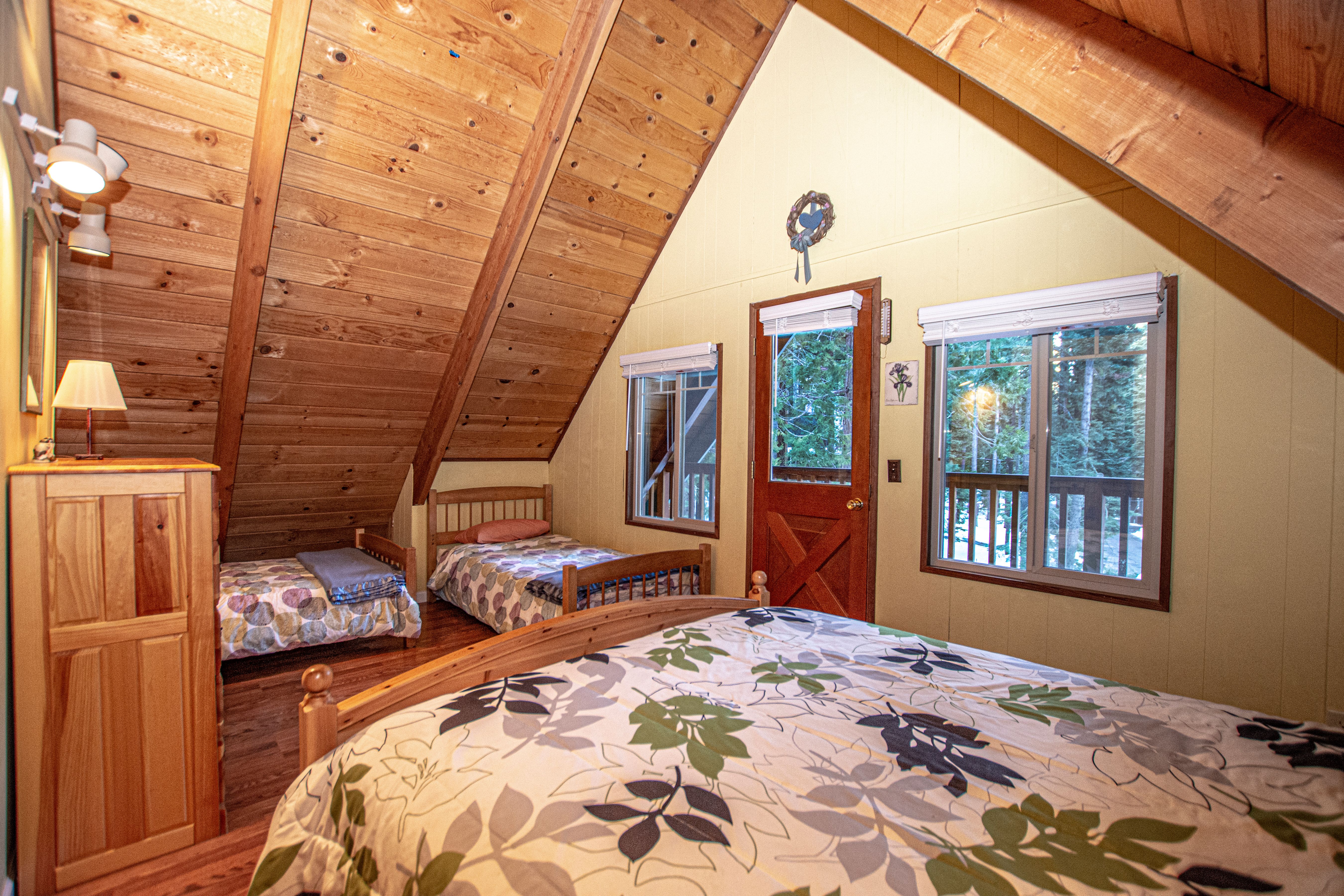 Stairs in living room lead up to two bedrooms, one with King and view of forested area, and the second with a Queen and two Twins. This bedroom also has a balcony over the front of house. Full bath in between the two bedrooms. Both bedrooms feature A-frame lofted ceilings for spacious atmosphere.