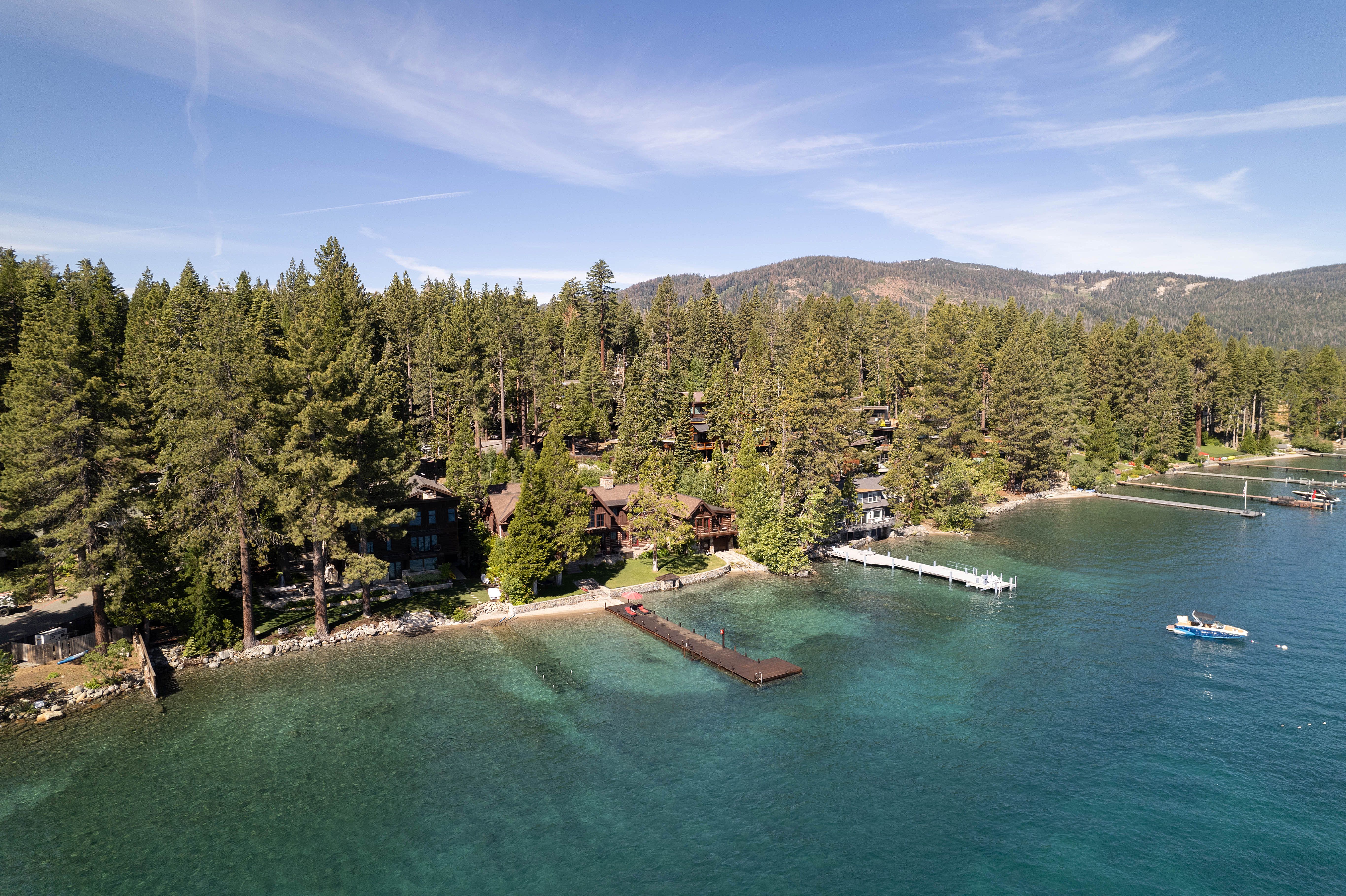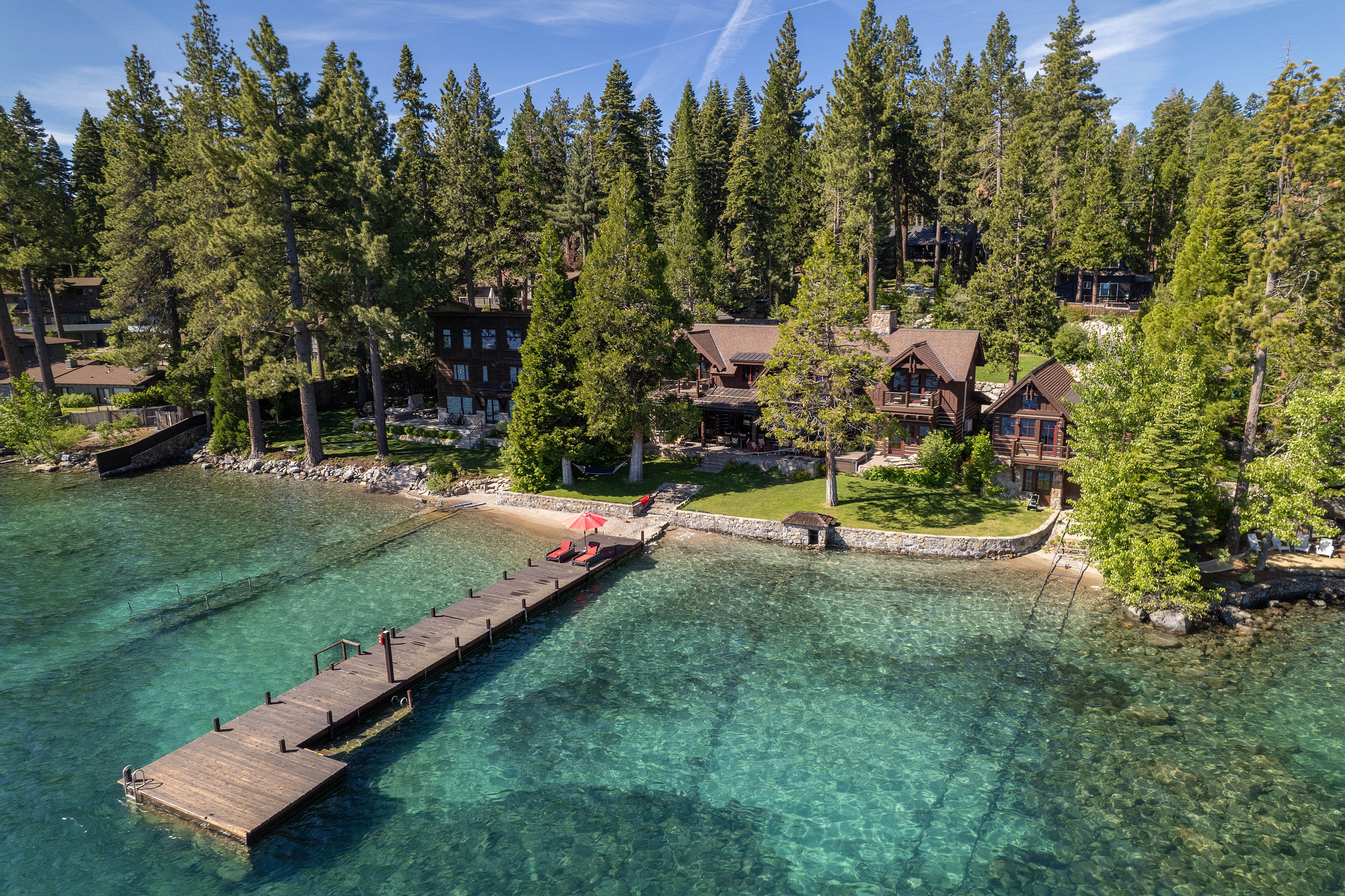 Lakefront Peaceful Waters Exterior Pier and House Aerial
