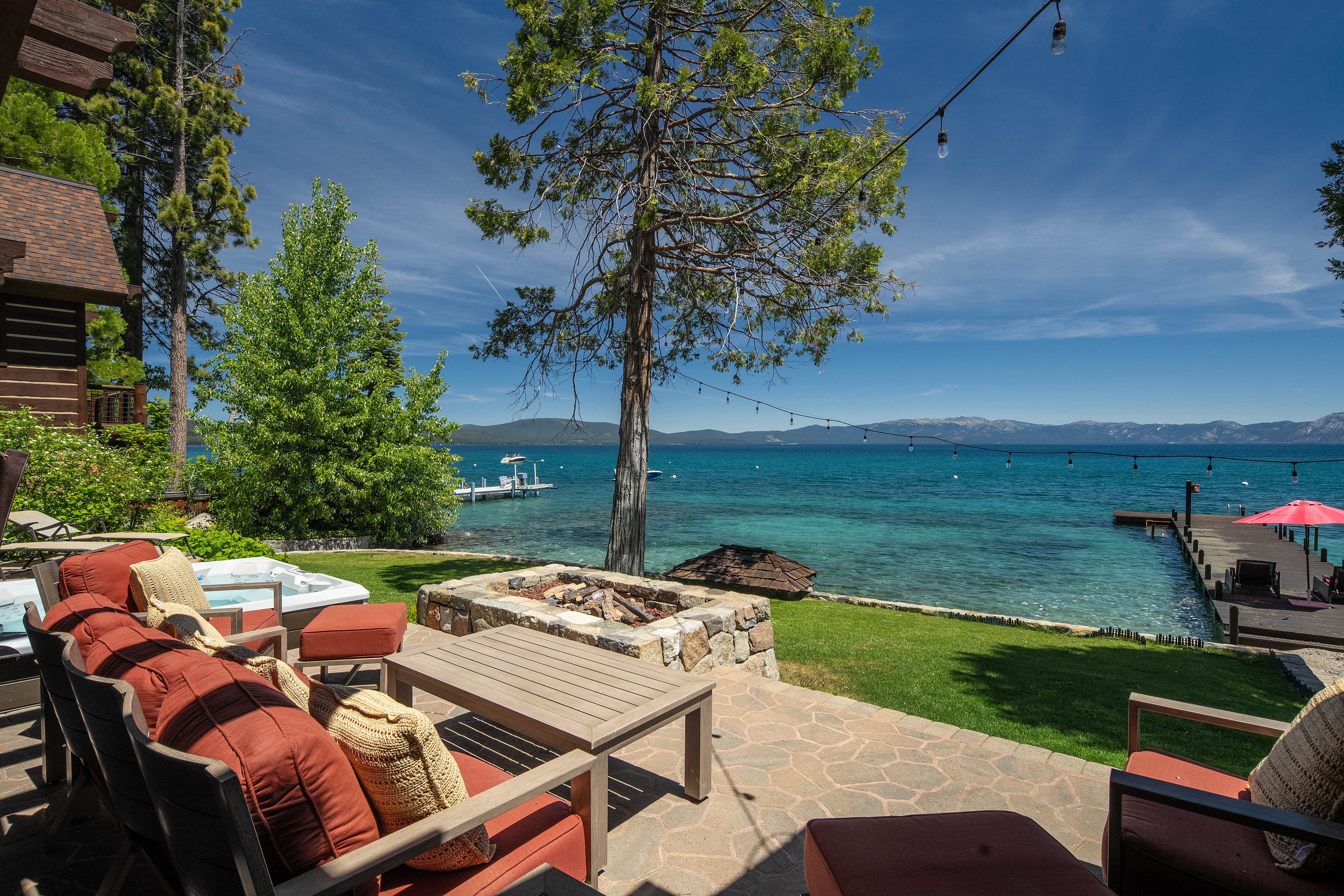 Lakefront Peaceful Waters Exterior Patio Hot Tub and Chairs